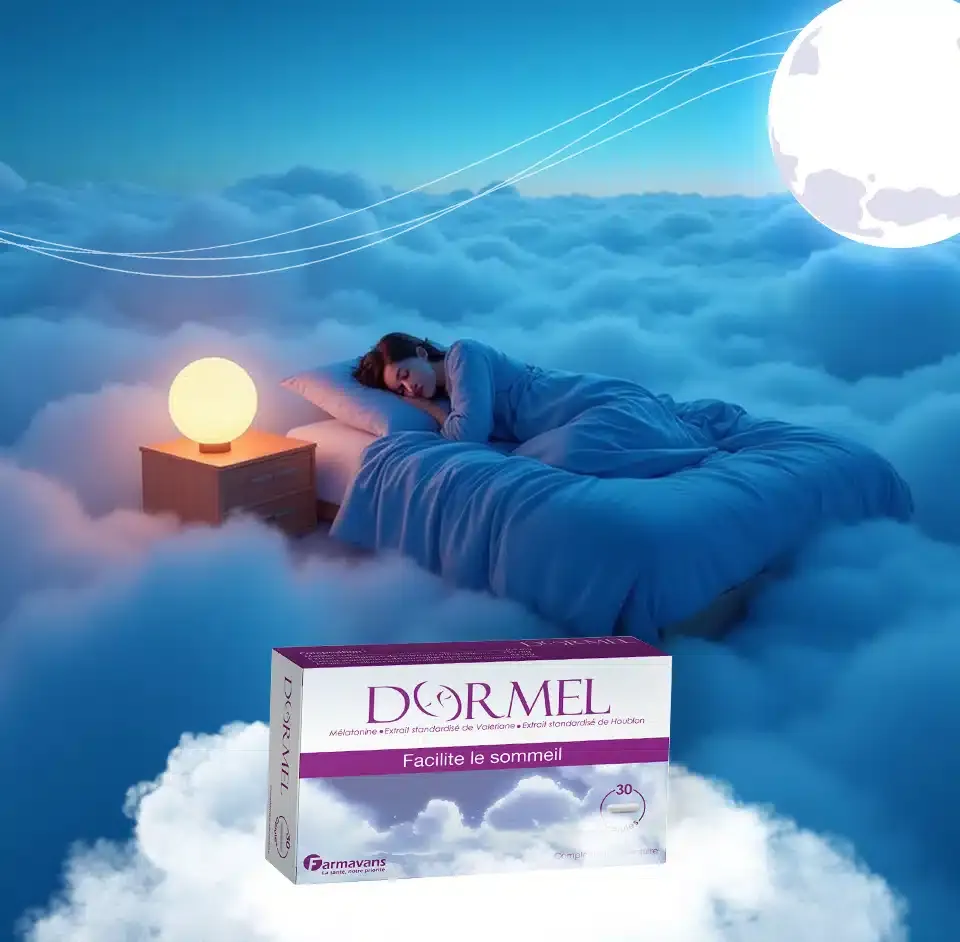 DORMEL facilite l'endormissemet et améliore la qualité de votre sommeil grâce à sa formule à base de mélatonine, valériane et houblon.